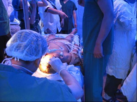 “帐篷手术室”内,天津抗震救灾医疗队专家们为青川颅脑损伤患者行开颅手术。
