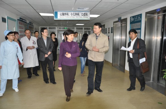 王华蓉一行实地察看了医院门诊大厅,内、外科住院楼及心胸外科迎检准备情况,并与院领导班子进行了座谈,了解我院在医院管理、院务公开、便民措施、院容院貌、诊疗环境、优化就医流程等方面对三甲复核工作的准备情况。