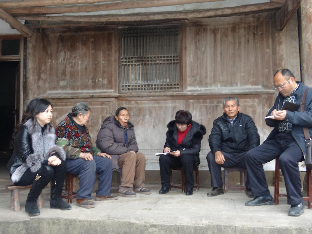 图一,院党委书记吴春瑛(右一)、院长刘峰(左一)与村干部共商扶贫帮困规划,谋划发展前景。