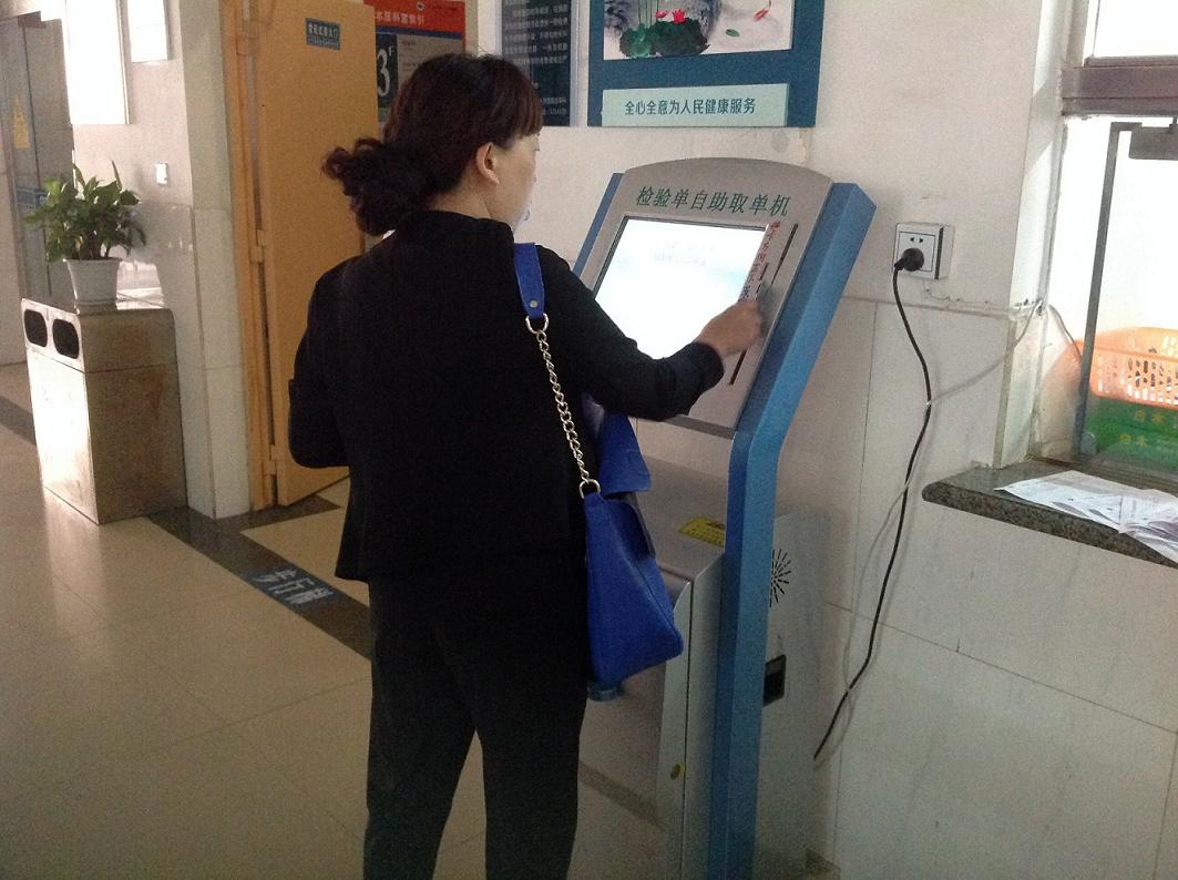 为保证患者准确、及时取到化验单,我院在门诊三楼设有检验结果自助取单机。患者拿着自己的化验单条形码对准自助取单机读码处,或者用就诊卡对准“磁卡刷卡器”刷卡即可取化验单。取单机可自动完成化验报告单打印,患者一般几秒内就能结束操作,拿到报告单。即使中午服务台没有工作人员上班,患者也可以自己自助取单。很多患者表示,这样一来,杜绝了取错他人化验单的可能性;而且可以在任何时间去取,非常方便。