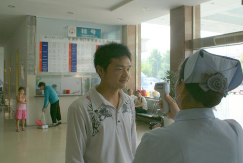 当发热病员被引导到发热门诊时,随时做好准备的医护人员立即投入工作。询问病史:刚从国外回来,伴咳嗽、咽痛、头痛、流涕、乏力等症状;再次测试体温(38℃ );血常规检查、胸片(抽血、胸片在发热观察室进行)。