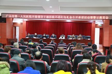 2014年11月27日下午,市第一人民医院在学术报告厅开展领导干部拒收不送红包礼金公开承诺活动暨警示教育会。院领导班子全体成员及全院副护士长以上中层干部和人事科、财务科、药学部、设备科、总务科等涉及人、财、物重点部门岗位工作人员参加了公开承诺活动暨警示教育会。刘峰院长主持会议。