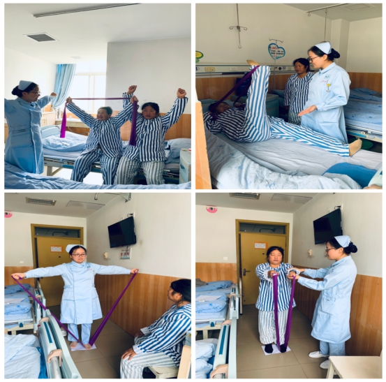 护士用专业弹力带指导患者进行康复训练