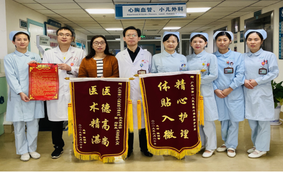 2019年9月25日,心胸血管、小儿外科迎来了一位老朋友。之所以称为老朋友,是因为来者刘老师是科室一位刚刚康复出院患者的家属。刘老师一家在爱人住院期间与医护人员朝夕相处,被医院精湛的医术与周到的护理所感动,这次是专程携锦旗和感谢信来看望大家的。
