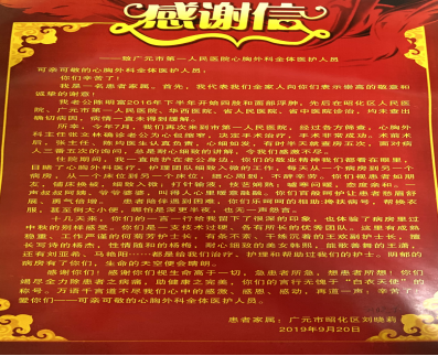 心脏手术在我院心胸外科属于成熟技术,多年的业务开展锻炼了一支高水平、高素质的专业医护队伍。凭着过硬的技术与周到的服务为数以千计乃至数以万计的患者送去了健康。细致入微的工作也感动着许许多多的患者。陈先生一家亲眼目睹了医生护士不分昼夜奋战在临床一线的辛劳,感受着视患者如亲朋的热情。虽然住院时间不长,但是每一位医护人员的爱好与特长他们记住了,迎中秋庆国庆联欢会的温暖他们记住了,广元市第一人民医院的高超技术与优质服务他们也记住了。