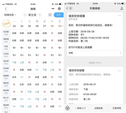 优质护理的目标是病人满意,护士满意,因此,改进了排班模式:使用智能排班程序——天使排班,同时,运用不同的颜色表示不同的班次,每个班次护士都有一种新鲜感。同时,护士躺在床上就会收到第二日的班次提醒,防止忘记自己的班次。
