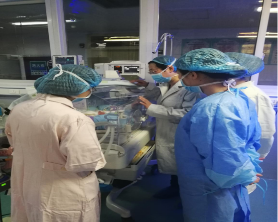 宝贝出生时浑身青紫,肺发育不良,肺泡萎陷,没有“第一声”啼哭,没有呼吸,儿一科医护人员立即给予宝宝PS(肺泡表面活性物质)及机械通气,使萎陷的肺泡扩张,帮助她正常呼吸。