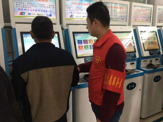 面对站在自助挂号机前一头雾水的大爷,身穿红色马甲的志愿者走上前来,简单几步帮助大爷成功挂号。大爷到三楼大厅就诊签到,看到了同样的红马甲志愿者站在就诊签到机前,很快指导大爷完成了就诊签到。