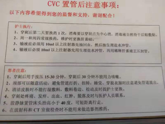 为了保证患者置管后的有效使用,科室将“置管后的注意事项”粘贴在每一位置管患者的床头,时刻提醒患者如何更好地保护导管,让患者参与到治疗过程中,同时,也进一步规范了医护人员的医疗行为。