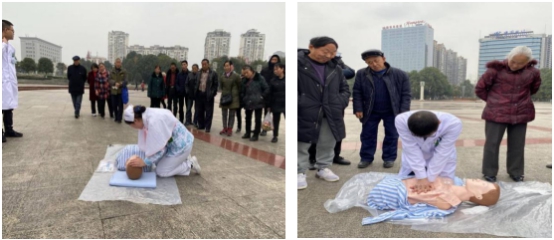 虽是寒风凛冽,但依然抵挡不住每一位志愿者如火的内心,大家积极邀请周边的市民,生怕落下一个人。当有较多的“学习者”参与进来时,志愿者为大家进行“心肺复苏”演练和示范教学。