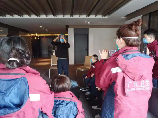 1月29日下午14点,广元医疗队开展穿脱防护服培训,为次日下病房做准备。