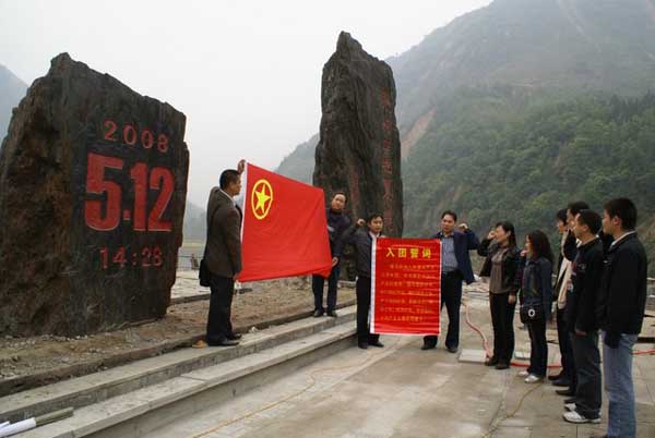 在青川东河口地震遗址公园,大家先后参观了石板沟堰塞湖,东河口村民原居住遗址、东河口小学遗址、东河口大桥遗址、抗震救灾诗词长廊图片展、纪念台等。在东河口小学遗址前,当目睹到被山体掩埋的村庄只剩下一个角落,一颗顽强的老梨树、一面红旗,听讲解员讲东河小学三位教师为抢救学生生命而英勇牺牲的先进事迹时,大家深感震撼,无不为之动容。纪念台前,大家为地震遇难者默哀,一一为遇难同胞敬献鲜花。在“5.12”大地震标志石碑前,大家重温了入团誓词,表达了永远跟党走,热爱祖国,知恩感恩,全心全意为病人服务的决心。