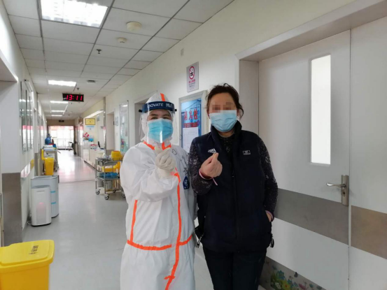2月14日,杜大姐被确诊新冠肺炎。入院时发热,动则呼吸困难,心态也是十分焦虑。考虑到她没有家人陪伴,刘瑛上班时,都会抽时间陪她聊家常,为她端水送饭,给予她心灵上的慰藉,鼓励她战胜病魔。在刘瑛的陪伴关怀和心理疏导下,杜大姐积极配合治疗,脸上也常常挂着笑容,就这样,随着时间一天天的推移,杜大姐呼吸困难的症状逐渐好转,体温也正常了,能够自行下床活动。经CT检查,她的肺部影像学显示炎症明显吸收,连续两次呼吸道病原核酸检测阴性。终于,在2月28日这个春暖花开的日子,阿姨如愿康复出院了。