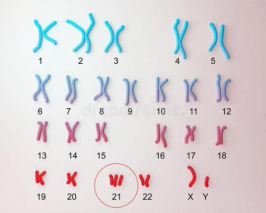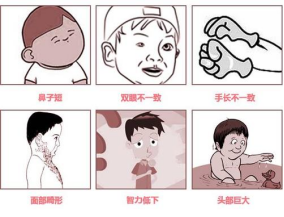 先天愚型又称唐氏综合征,是一种染色体病。每个孩子都有23对(46条)染色体,“先天性愚型”的孩子第21对染色体比正常人多了一条,又称做21-三体综合征。主要表现为严重的智力低下,可合并先天性心脏病、唇腭裂等多种畸形。先天愚型儿长相特殊,眼外上斜,眼距宽,塌鼻梁,口常半开,舌头外伸等,所以又称“伸舌样痴呆”。怀有先天性愚型胎儿的孕妇早期可出现先兆流产、胎死宫内,生产时可能有新生儿窒息或死亡。先天愚型儿在婴儿期易患肺炎死亡。即使成活,在智能方面也多为中度或重度低下(智商<50),而且可伴有其他严重的多发畸形,如先天性心脏病(30%)、消化性畸形(6%)、听力和视力障碍(70%)和白血病(1%)等。