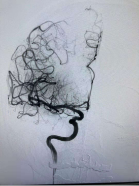 由于何奶奶有溶栓禁忌,不能行静脉溶栓治疗。医务人员当机立断,决定行全脑血管造影术+必要时机械动脉取栓术。造影发现何奶奶全身血管重度迂曲,右侧颈内动脉末端完全闭塞。