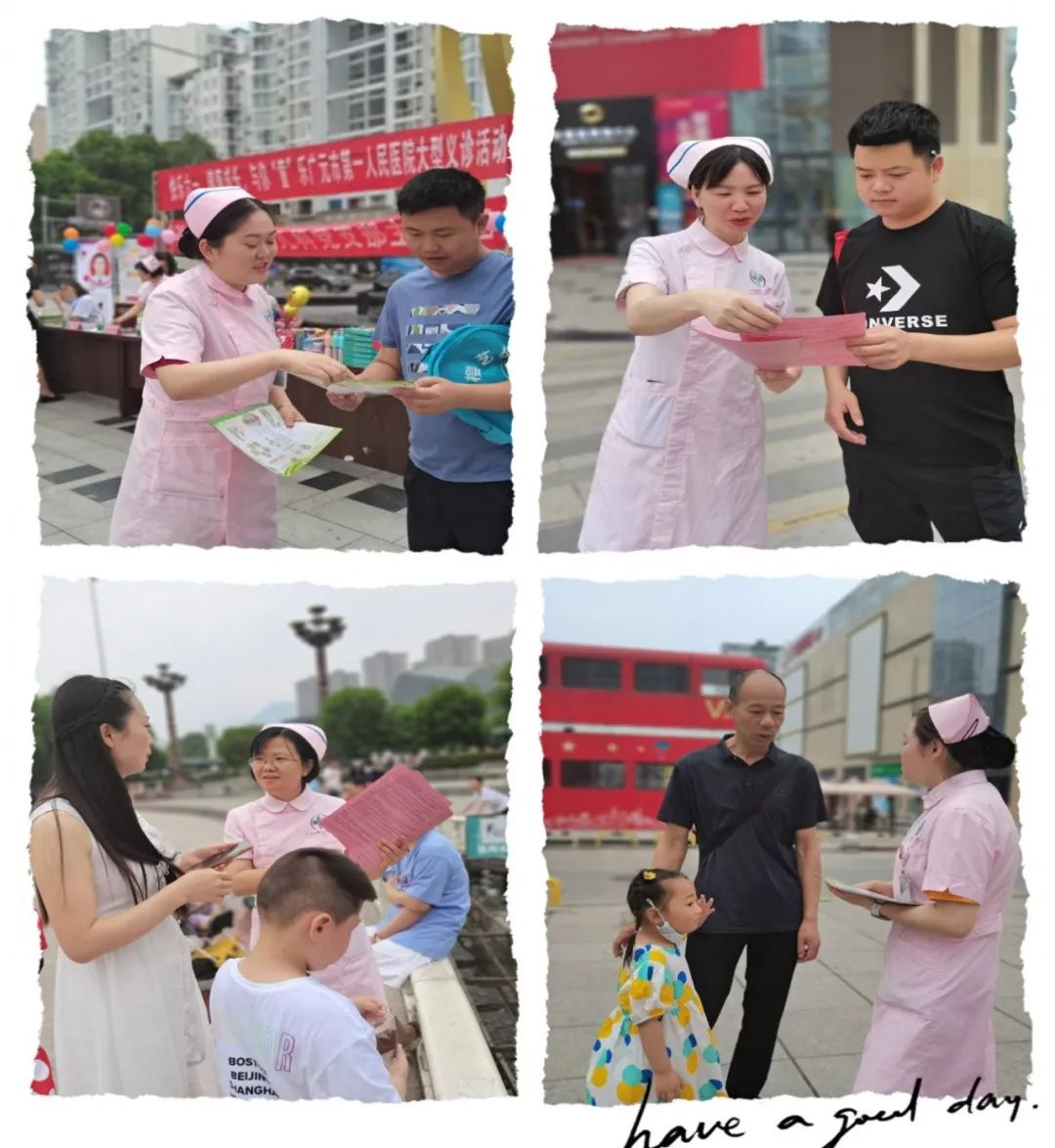 儿科医护人员为前来就诊和咨询的儿童及家长发放如何预防手足口病、如何应用口服补液盐、如何正确地进行母乳喂养、宝宝惊厥的“四要”与“四不要”等各类宣传手册 ,科普孩子预防保健知识。