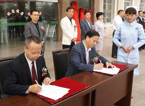 省医学科学院·省人民医院副院长代小舟和市第一人民医院 院长杨晋平在协议书上签字