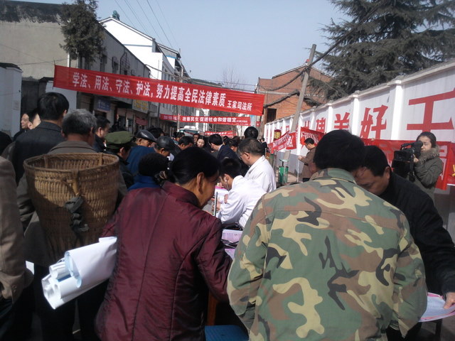 2011年“农村法制赶场”活动,主要以协调社会关系、规范社会行为、解决社会问题、化解社会矛盾、促进社会公正、应对社会风险、保持社会稳定为目标,开展的主题是:深入开展“六五” 普法,推进农村依法治理。内容包括:法律法规宣传、基层民主宣传、国家政策咨询、免费法律援助、医疗卫生健康、科技咨询服务等等。活动中,我院完成义诊、咨询群众100余人次,免费测血压50余人次;宣传展版6幅。