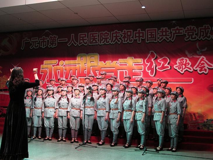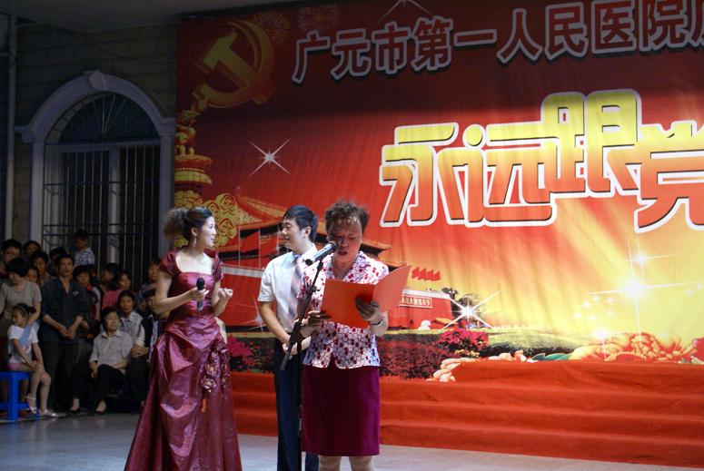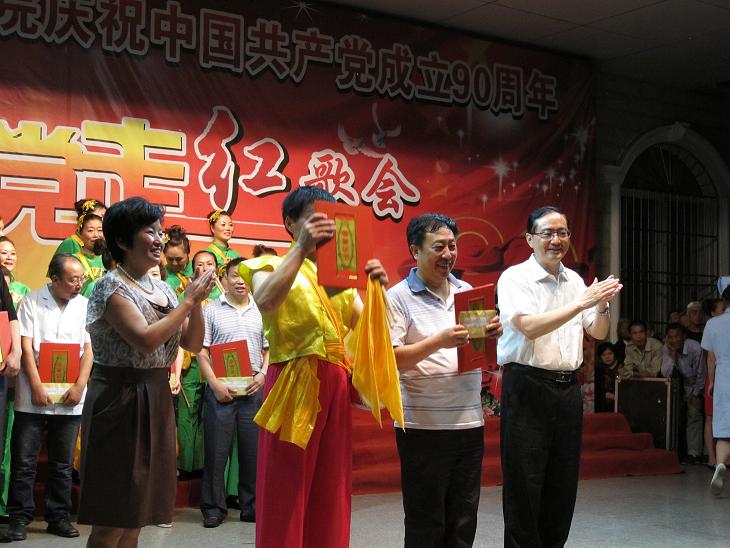 为庆祝中国共产党成立90周年,弘扬爱国文化、传承红色精神,抒发全院党员干部职工爱党爱国爱院热情,推进医院文化建设,丰富职工文化生活,扎实推进创先争优活动,把 “忠诚理想、敬业奉献、感恩奋进、健康生活”理想信念教育活动进一步引向深入,6月18日晚,我院在新院区门诊大楼前隆重举办了“庆祝中国共产党成立90周年永远跟党走红歌会”。全院共7支代表队近400人参加了演唱,市委宣传部、市直属机关工委、市文化局、市卫生局等有关领导应邀出席了红歌会。