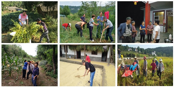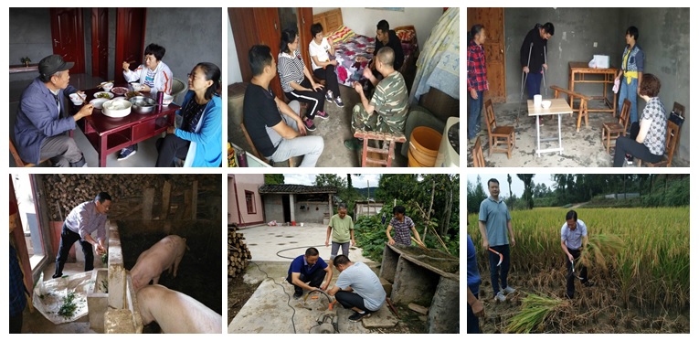 在铧山村,院党委书记吴春瑛在韩忠林家中帮助做家务,下厨煮饭,打扫猪圈,整理房前屋后卫生,教其养成良好卫生习惯。通过拉家常,宣传党的扶贫政策,转变思想观念,增强致富信心。刘峰院长、吴春瑛书记及其他帮扶干部冒着烈日帮助贫困户收割稻谷、玉米、挖地种菜,通过与贫困群众促膝谈心交流,对贫困群众家庭、生产生活更加了解,增进了与贫困群众的感情。帮扶干部在贫困户罗星锦家中,详细了解其身患重病的母亲病情及治疗情况,指导其正确面对疾病,增强战胜疾病信心,并送上300元慰问金。并冒着大雨,到田间地头了解瓜蒌、核桃树、猕猴桃苗长势,查看水稻成熟情况。贫困户罗德甫的孙子罗兵,今年考上南充职业技术学院计算机应用专业,帮扶干部在积极帮助其办理贫困户助学金申请的同时,希望他到学校后要充分利用好难得的学习机会,好好学习真本领,为家乡新农村发展贡献力量,并送上300元资助金。在贫困户家中,帮扶干部们坚持“同吃同住同劳动”,在劳动中,在吃饭时,在交谈里,不失时机地向群众讲党的扶贫政策、讲党恩,开展感恩教育,鼓励发展产业,增强脱贫致富能力。通过拉家常,宣传党的扶贫政策,希望他们在充分利用好扶贫政策的同时,不能有“等靠要”的思想,一定要自力更生,奋发图强,勤劳致富。