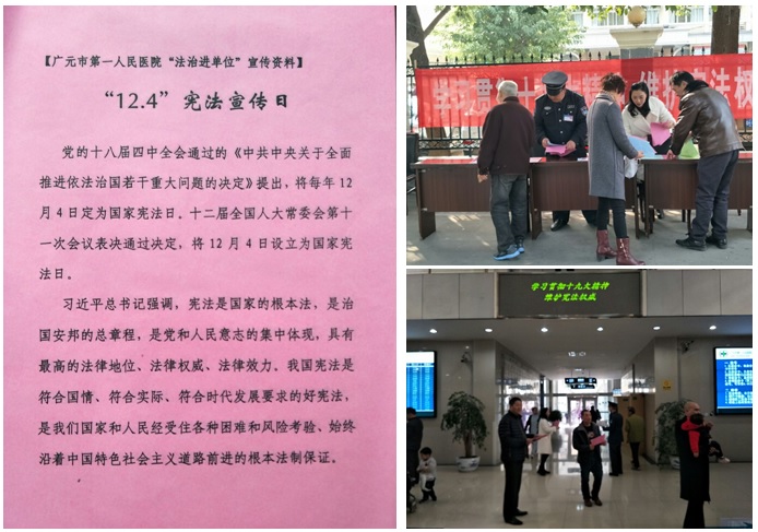 为深入学习贯彻落实党的十九大精神,全面推进依法治市,推动全社会树立宪法意识,增强全民法治观念,按照市依法治市办、市司法局《关于开展2017年“12.4”国家宪法日法制宣传教育活动的通知》(广司法发【2017】72号)要求,我院于12月4日在医院大门外开展了以“学习贯彻十九大精神,维护宪法权威”为主题的法治宣传教育活动。营造了全院学习宪法,崇尚法律的良好氛围,进一步推进了依法治院进程。