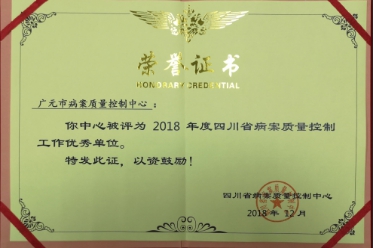 广元市病案质量控制中心成立于2010年,现挂靠在广元市第一人民医院。2018年5月,重新调整病案质控中心专家组成员。为充分发挥医院在全市病案管理和病案质控方面的专业优势,质控中心组织了多次病案管理相关培训和督导检查,在督导全市各级医疗机构规范病历书写、加强病案管理与内涵质量控制等工作中取得显著成效,得到各级医疗机构的认可和肯定。通过对各级医疗机构病案管理的指导和管理,全市病案首页上报率和病案质量评分明显提升,2018年全市病案首页质量评分96.15分,全省排名第二。