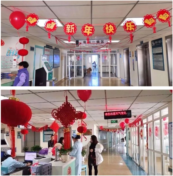 腊月二十八,一走进骨科一病区,便被科室里悬挂的红灯笼、精巧的中国结、飘动的红气球给吸引了,象征吉祥、喜庆、热情的红色将骨一科紧紧包裹着,红色不仅仅是为了让患者感受到节日的喜庆,感受到家庭般的温暖,更寄托了医护人员期盼患者早日康复的美好愿望。