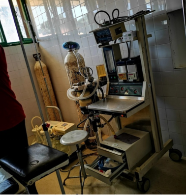 卡松果医院的手术室现有条件很差,麻醉机已损坏多年、全麻药物缺失、手术工具不全,且现存工具锈迹斑斑、无菌中单上存在大面积血渍、手术室完全没有市电供应、全凭发电机供给、手术室无菌不达标……只有一台最基本的监护仪和氧气罐吸氧,所有的医疗用品都是医疗队带过去的。