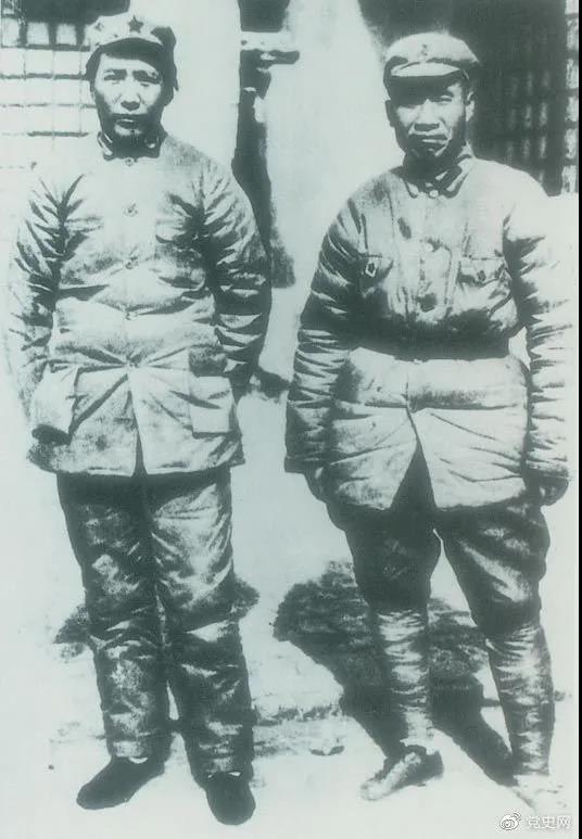 1937年7月7日,卢沟桥事变爆发。8日,中共中央通电全国,号召结成民族统一战线抵抗日本侵略者。图为1936年冬毛泽东和朱德在陕北。