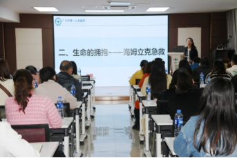 本次培训采取理论培训和实践操作相结合的方式进行。市第一人民医院儿科副主任刘勤、权婷护士、王义瑾医生分别就流感的防治、心肺复苏术及儿童海姆立克急救法、外伤止血与包扎等内容开展专题讲座。为了更直观地感受和掌握急救要领,理论培训会后,参训老师们分成5组于临床技能培训中心进行了操作实践培训,进一步巩固所学知识。