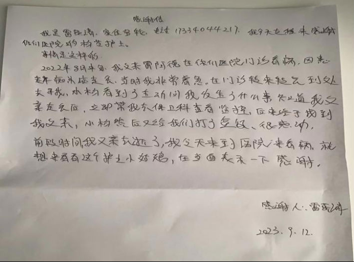 这位阿姨姓雷,当时,她父亲在市第一人民医院门诊就诊,因患有老年痴呆走丢了。雷阿姨在门诊转来转去寻找了很久,满面愁容、焦灼万分。导诊护士杨苓见状,便上前主动询问发生了什么事。了解事情原委后,杨苓立即带着雷阿姨前往保卫科查看监控。经过20多分钟的仔细查找,终于在监控中发现其父亲患者独自一人穿过门诊大厅,从放射科走到西侧楼处,最后在西辅楼旁边找到了她的父亲。