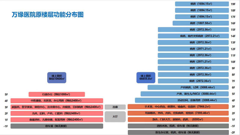 三、功能布局。万缘医院总体分为两部分,具体为康养楼和住院病区。其中康养楼总建筑面积1.06万㎡,层高为5层;住院病区总建筑面积6.62万㎡,最高楼层19层,1-3楼为门急诊、医技用房,其余部分为住院病区。