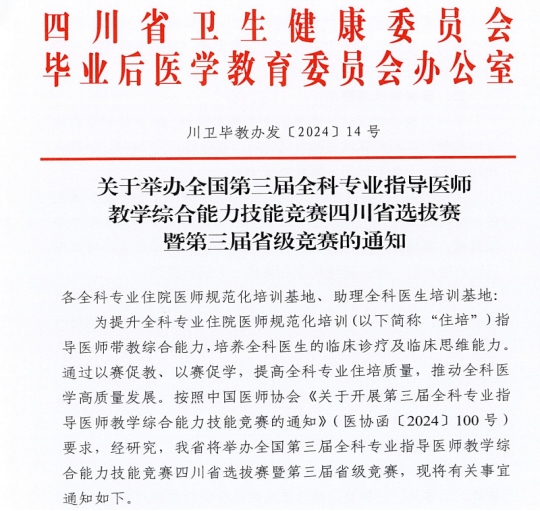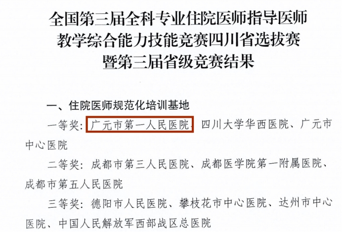 为提升全科专业住院医师规范化培训指导医师带教综合能力,培养全科医生的临床诊疗及临床思维能力,按照中国医师协会《关于开展第三届全科专业指导医师教学综合能力技能竞赛的通知》(医协函〔2024〕100号)要求,四川省于近日举办了全国第三届全科专业指导医师教学综合能力技能竞赛四川省选拔赛暨第三届省级竞赛。经培训基地申报、专家评审等环节,广元市第一人民医院从全省45家全科住培基地脱颖而出,荣获四川省一等奖,同时将代表四川省参加全国竞赛,充分彰显了医院全科专业的教学水平和教学实力。