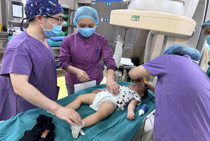 7月5日上午,在家人饱含期待又夹杂着担忧的目光中,亮亮被送入了手术室。全身麻醉、气管插管、血管穿刺、缺损定位、封堵器释放……在麻醉手术中心、超声诊断科等多学科紧密配合下,陈玺全副主任团队为亮亮实施了经皮动脉导管未闭封堵术。每一步都是行云流水,一气呵成,在场的医护人员都小心翼翼地,用自己的方式呵护着一颗颗小心脏。