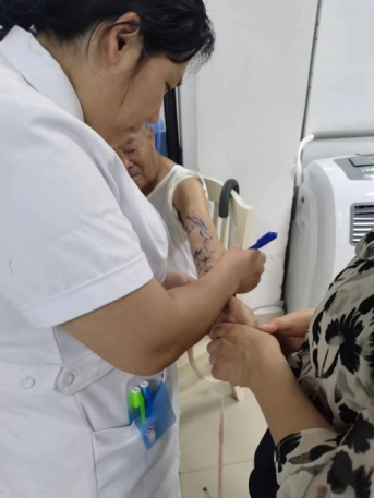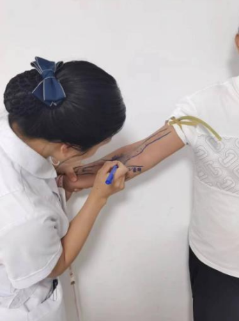活动中,肾病内科副主任杨帆负责彩超筛查工作,凭借丰富的临床经验和精湛的专业技术,为每一位患者进行详细的检查,并绘制出每一名患者的血透通路走向,标记出发现的通路问题。副护士长李会带领护理团队负责规划穿刺点位,并将规划的血管通路拍照上传到系统中,针对每名患者不同血管条件,为每一名透析病人个体化建立了精准的血透通路穿刺点位。