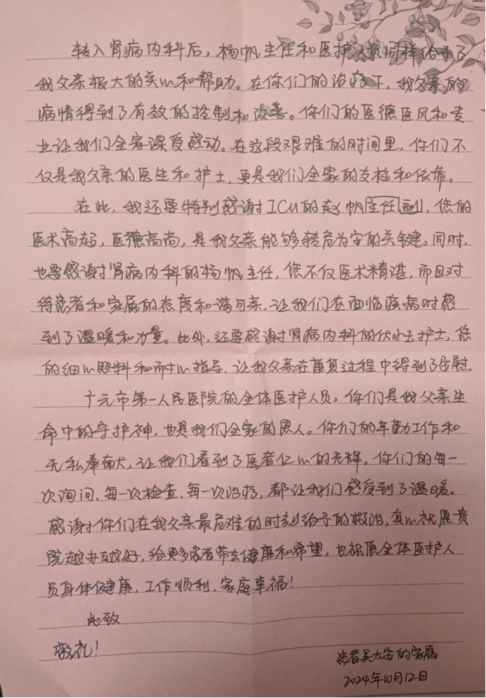 患者家属在信中特别感谢了ICU的赵帆副主任医师、肾病内科的杨帆副主任和伏小玉护士,他们医术精湛、和蔼可亲,带给病人无尽的温暖和力量,他们的细心照料和耐心指导,让病人的病情得以快速康复。
