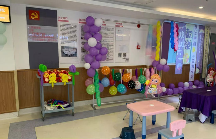 气球魔法飘满廊:各式萌趣气球点缀病房走廊,营造欢乐童趣氛围。