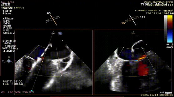 手术当日,在全身麻醉及TEE全程导航下,陈玺全副主任团队凭借丰富的临床经验与精湛操作技巧,顺利完成房间隔穿刺、瓣叶精准定位等关键步骤。针对患者二尖瓣A2/P2 区域反流靶点,团队精准夹合瓣叶,经X-plane技术与三维超声反复确认夹持质量后,成功释放一枚MitraClip XTR夹子。术后即时评估显示,患者二尖瓣反流由术前3 +重度降至轻度,平均跨瓣压仅3mmHg,手术达到预期效果,全程无并发症发生。
