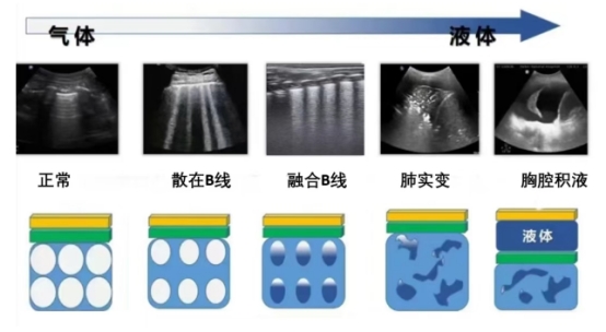 炎症渗出期:肺内气/水比例逐渐减少,肺部超声表现从起初的肺间质炎性渗出(散在B线),到炎症渗入肺泡(融合B线),到气体的减少甚至消失、肺泡萎陷(肺实变),再到炎症累及胸膜渗出(胸腔积液)等;