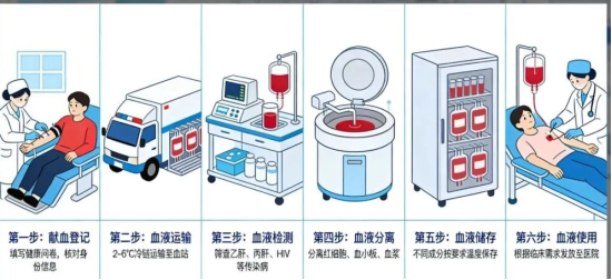 5. 送往医院,救人性命:当医院发出用血申请,血站会第一时间将匹配的血液通过冷链运输送到医院输血科,再由医护人员核对无误后,输注到患者体内。