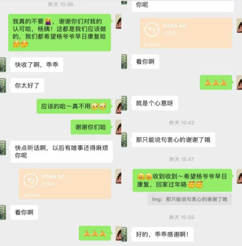 随着老人病情逐渐好转,家属心中满是感激,总想用自己的方式向医务人员表达谢意。“谢谢你们对我的认可,这都是我们应该做的,我们都希望杨爷爷早日康复。”出院前夕,患者家属欲通过赠送红包、微信转账等方式感谢陈丹护士两个多月的悉心照料,均被她婉言谢绝。