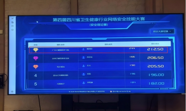 理论赛上,广元卫健网安护卫队团队积分斩获全场第一。魏镇阳同志凭借扎实的理论功底,以244分领跑全场。实操赛上,团队沉着应战、默契配合,排名全省第7。最终,团队以总分1435分,魏镇阳个人得分1079分,助力团队位列全省第四,成功拿到全国卫生健康行业网络安全技能大赛“入场券”。