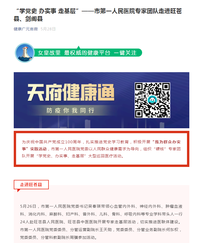 健康广元官微:“学党史 办实事 走基层”——市第一人民医院专家团队走进旺苍县、剑阁县