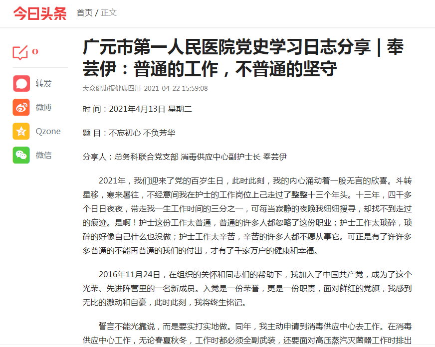 今日头条:广元市第一人民医院党史学习日志分享 | 奉芸伊:普通的工作,不普通的坚守