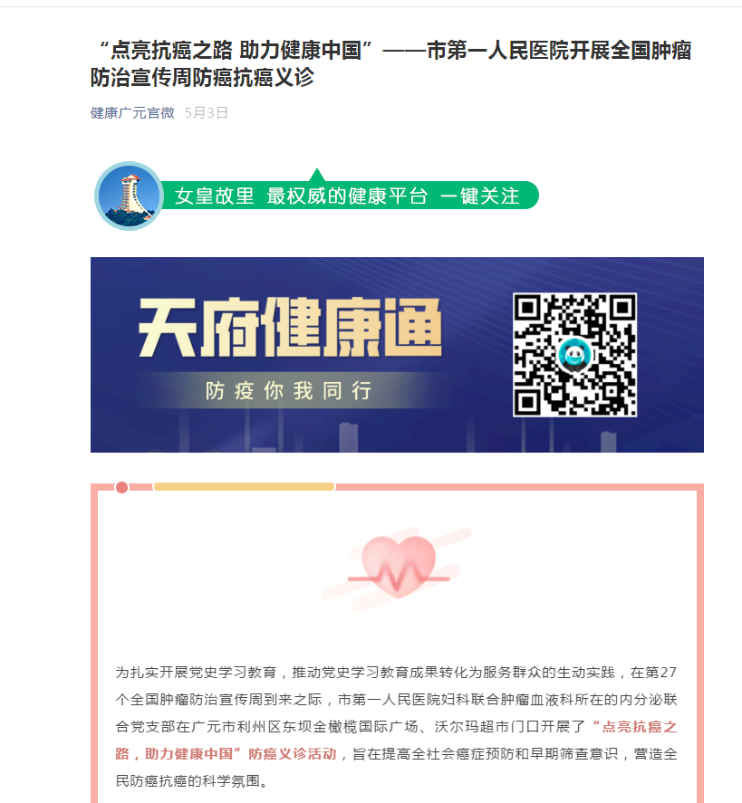 健康广元官微:“点亮抗癌之路 助力健康中国”——市第一人民医院开展全国肿瘤防治宣传周防癌抗癌义诊