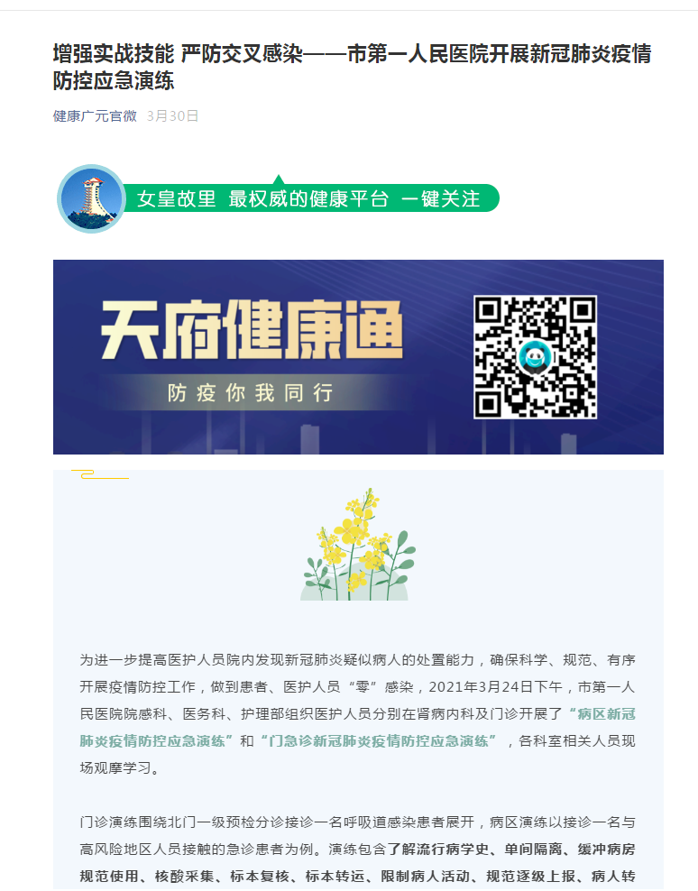 健康广元官微:增强实战技能 严防交叉感染——市第一人民医院开展新冠肺炎疫情防控应急演练