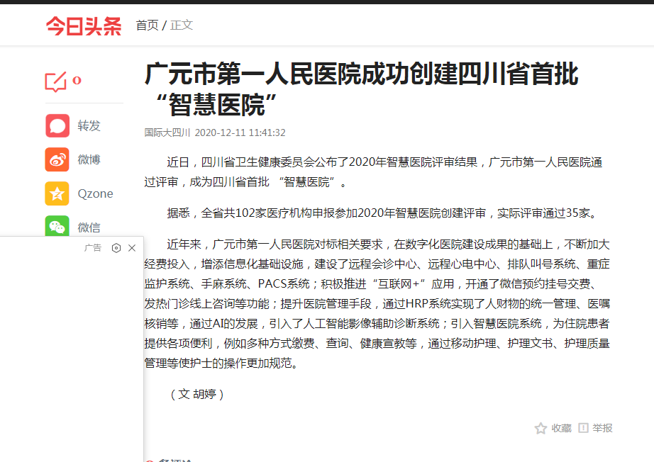 今日头条:广元市第一人民医院成功创建四川省首批“智慧医院”