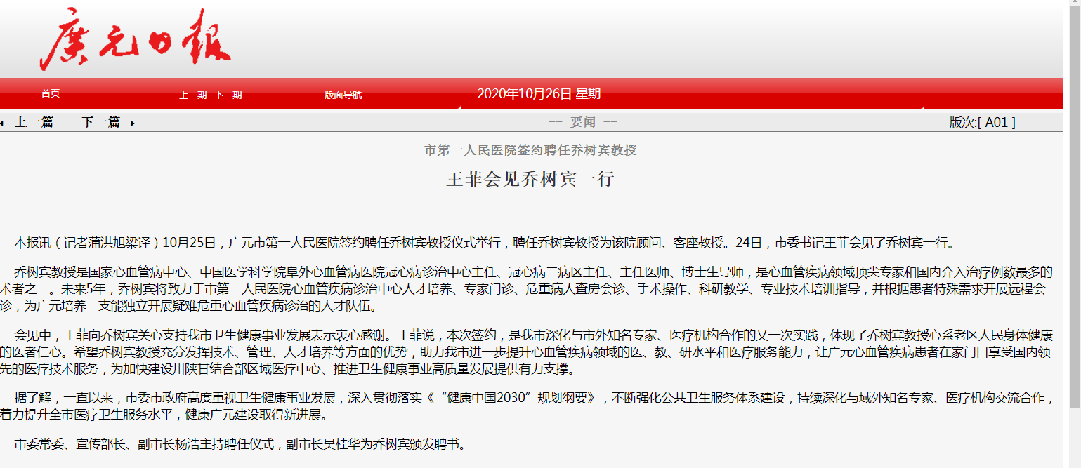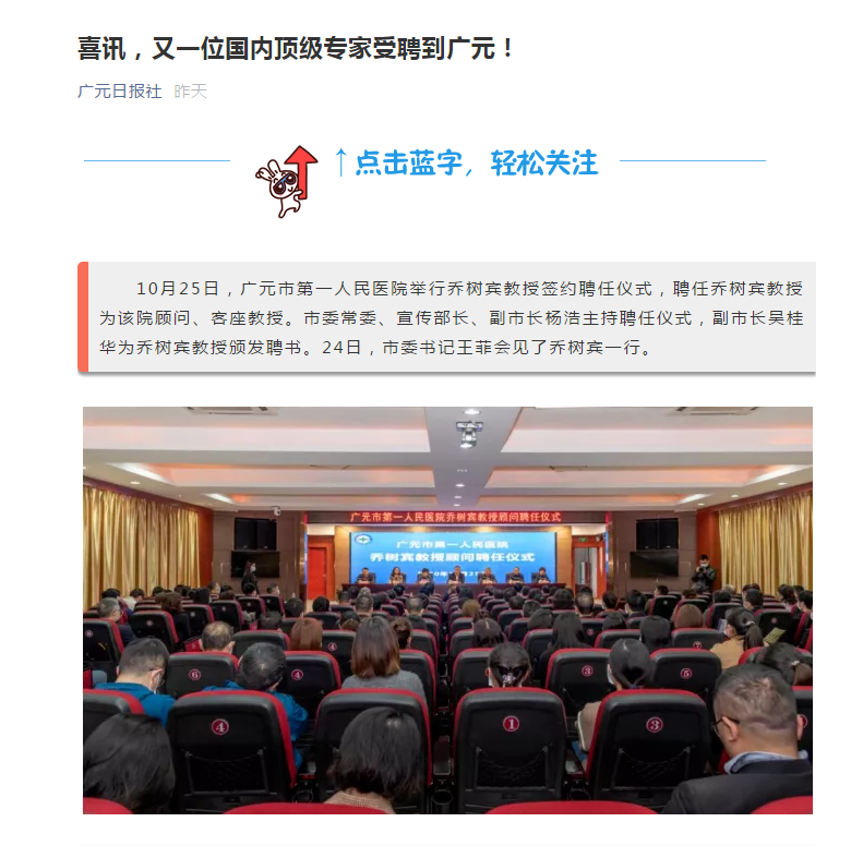广元日报:市第一人民医院签约聘任乔树宾教授 王菲会见乔树宾一行