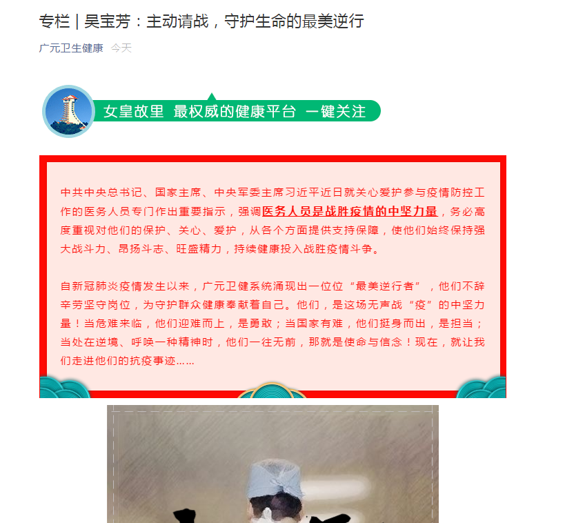 广元卫生健康:专栏 吴宝芳:主动请战,守护生命的最美逆行