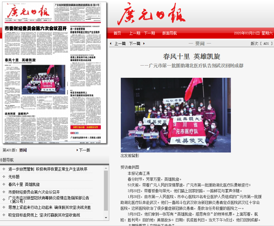 广元日报:春风十里 英雄凯旋 ——广元市第一批援助湖北医疗队告别武汉回到成都